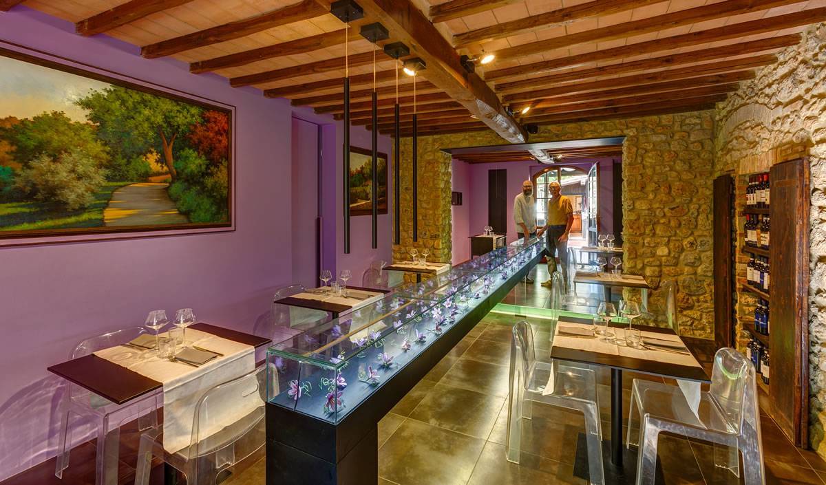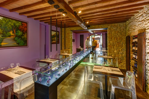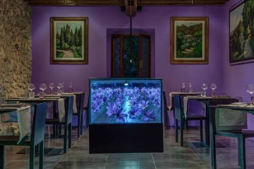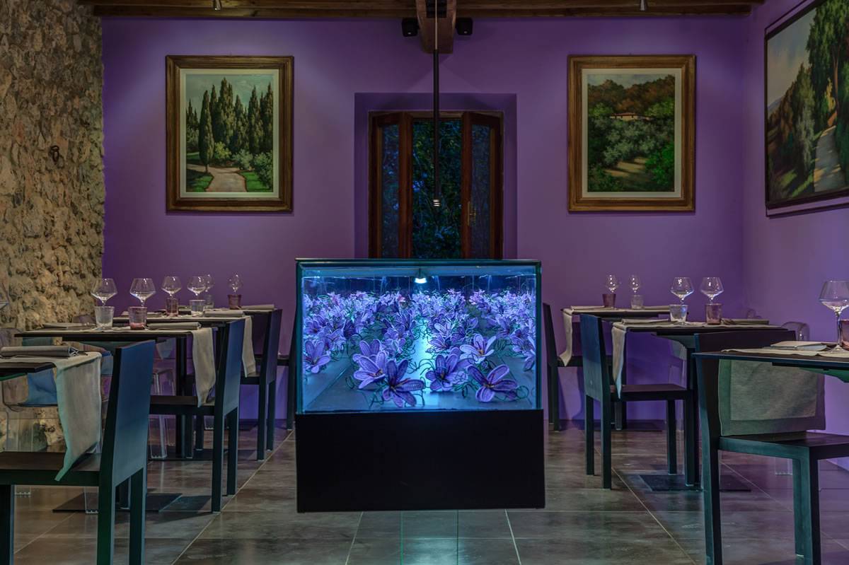 The Zafferano restaurant in San Gimignano features chestnut beams and red bricks, combined with a completely black floor; exposed stone walls with transparent or black chairs, a door dating the 1700s and a glass bulletin board, in which dozens of crocheted saffron flowers are lit by hundreds of LEDS; walls painted in deep lilac hues, like saffron flowers. And finally, the oil paintings by Fabrizio Ferrari, a colourful feast for the eyes.